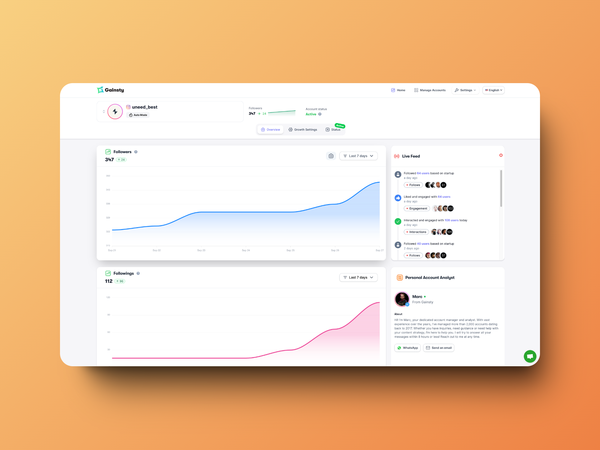 When you connect your Instagram account, you'll need to wait a little while for your account manager to connect to your account and verify that everything is working. Yes, that's right: Gainsty's principle is to let a human manage your account, not a bot. I admit I was initially reluctant to this idea, and I probably would have refused if my Instagram account was more personal or more important. But after thinking about it, I believe this approach makes sense: